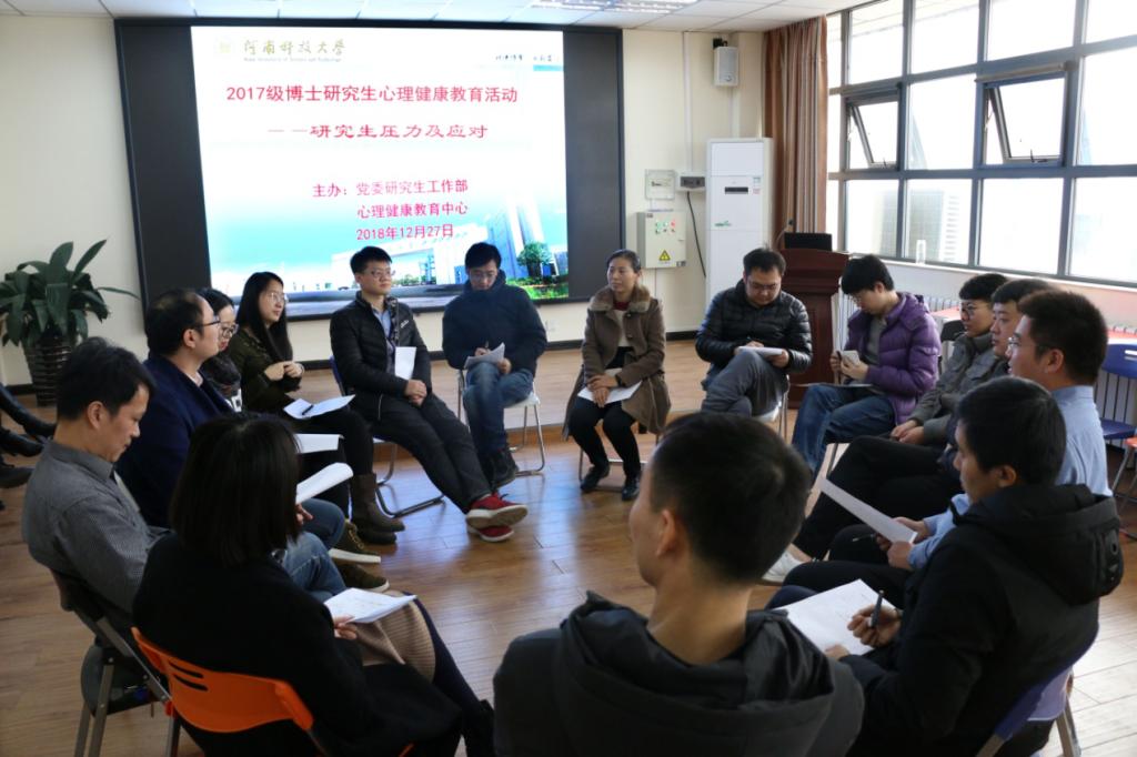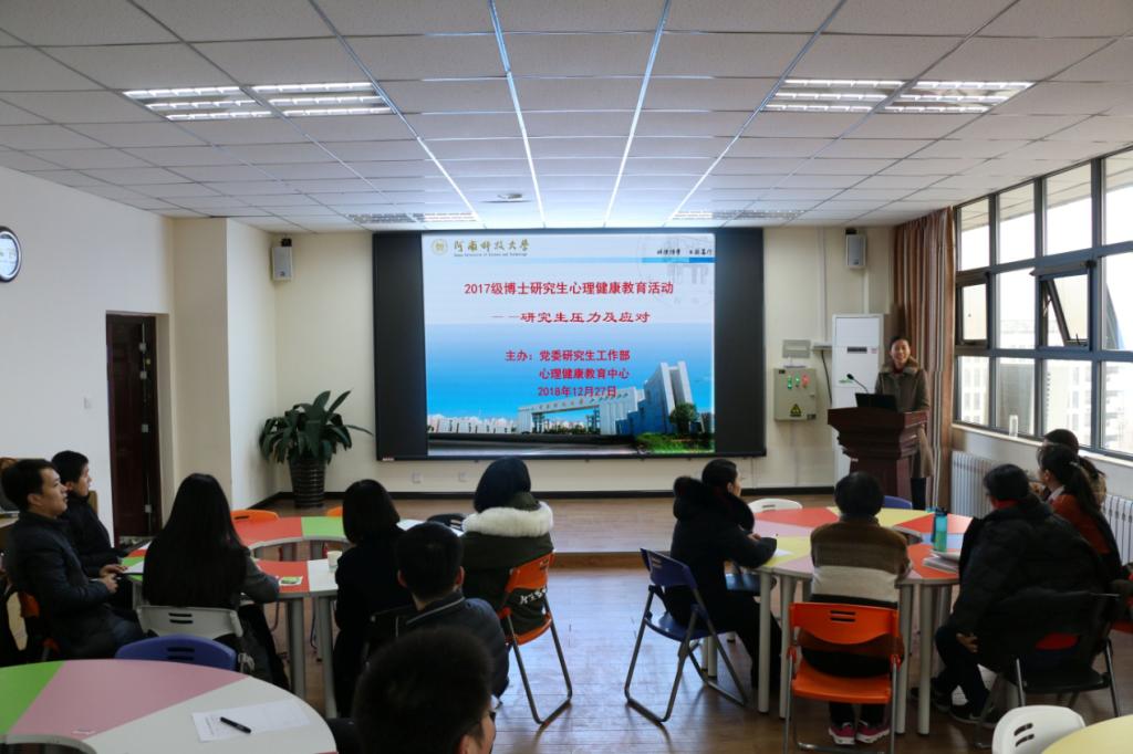 12月27日上午,由党委研究生工作部、校心理健康教育中心联合举办的2017级博士研究生心理健康教育活动在校心理健康中心举行。活动由校心理健康教育中心毛俊青老师主持,2017级全体博士研究生参加。