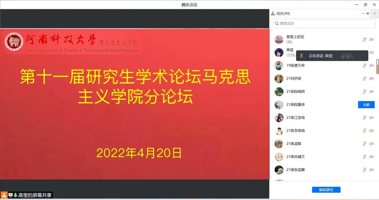 为活跃学术气氛,共建一个地理学及相关领域的学术交流平台,帮助在校研究生尽早了解学科前沿,明晰学科发展动态,准确定位自身,明确努力方向,河南科技大学马克思主义学院于4月20日线上举办了“第十一届研究生学术论坛马克思主义学院分论坛”,马克思主义学院副院长苗贵山、研究生辅导员杨麟慧及部分老师出席本次论坛,马克思主义学院全体研究生参加。