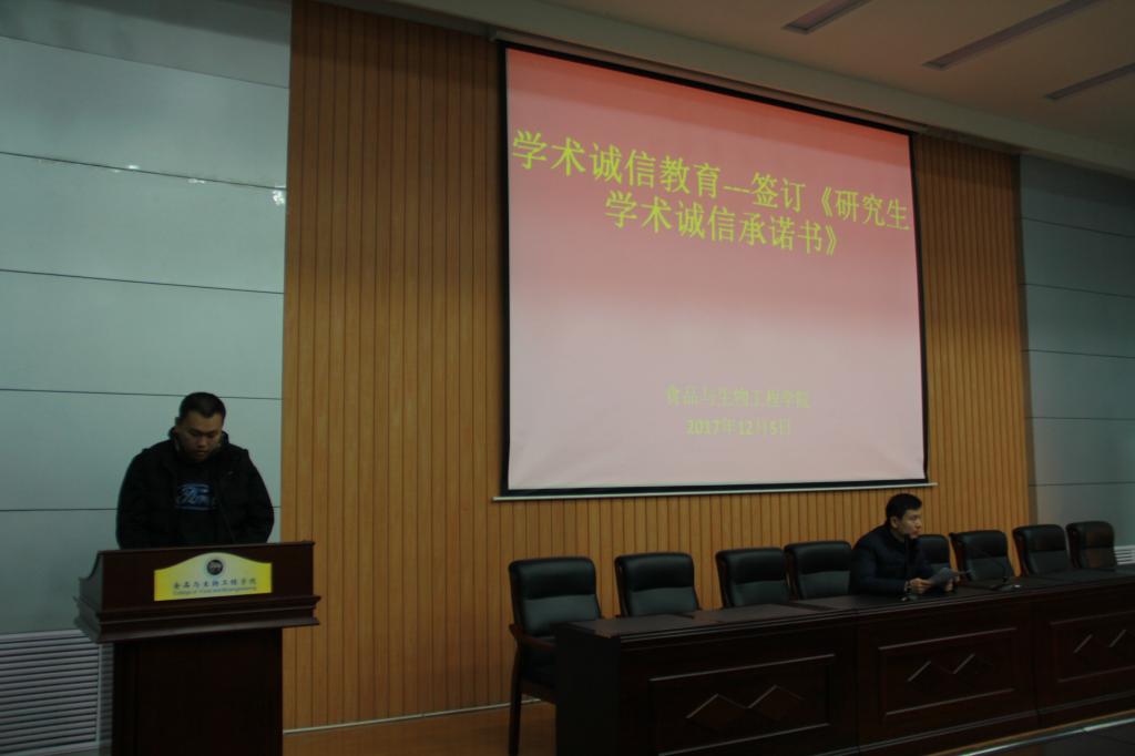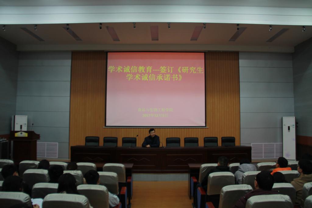 为使研究生树立正确的科学道德观,遵守学术规范,坚守学术诚信,12月5日,食品与生物工程学院在工科4—206学术报告厅面向食品学院全体研究生进行学术诚信教育活动。本次活动由食品学院研究生辅导员王烨老师主持。