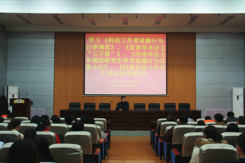 为进一步加强研究生学风建设,提升研究生科学道德精神和学风自律意识, 11月25日下午,食品与生物工程学院在工科4—206学术报告厅开展科学道德及校规校纪相关学习活动。本次活动由食品学院研究生辅导员王烨老师主持,食品全体研究生参加学习。