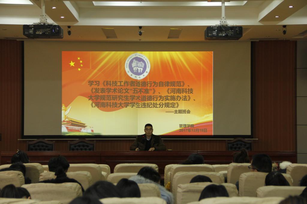 为进一步深入贯彻学习党的十九大精神,培养研究生良好的科学道德品行和学习习惯,加强科学道德与学术诚信意识,进一步激励我院研究生在学术研究中不断开拓进取、坚守道德诚信2017年12月18日下午3:30管理学院全体研究生在文科一号S105学院会议室召开主题班会,集中学习了关于规范“学术道德行为”的一系列文件规定。会议由江迎莹老师主持,管理学院全体研究生参加,研究生辅导员徐家宁老师出席会议。
