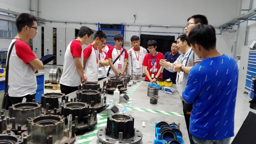 下午,在李博学校友的陪同下,实践队参观了轴承自动化生产线车间、轴承磨加工车间和轴承装配车间,在与一线员工进行交流学习的过程中,队员们对轴承的生产工艺、生产过程有了进一步的认识,深刻体会到理论与实践相结合的重要性。随后,队员们又来到了轴承精密检测与测量实验室进行参观学习,并在参观途中与李博学校友就轴承检测过程中采集到的实验数据及之后的数据处理分析进行了详细的技术交流。最后,在企业技术负责人张小波的带领下队员们来到集团园区的轴承陈列馆,了解了SKF的轴承发展史、参观了SKF自主创新的轴承部件和世界领先的自创实验机,这些都使队员们大开眼界、获益匪浅,队员们纷纷感慨道:看了这些才深刻体会到“创新是引领发展的第一驱动力”的含义。