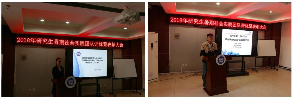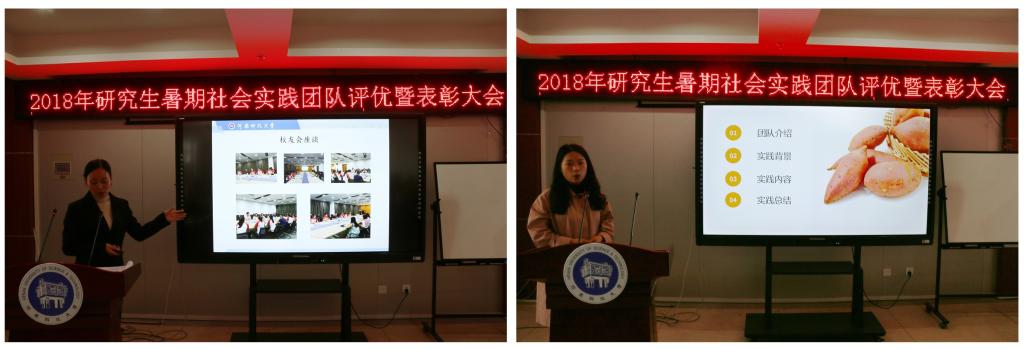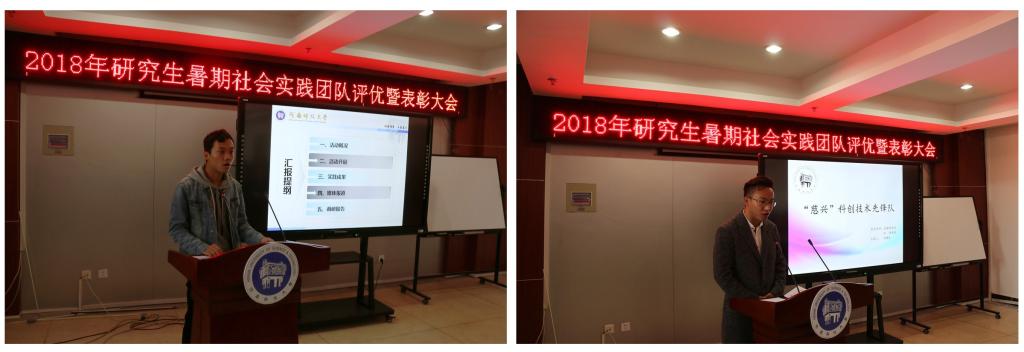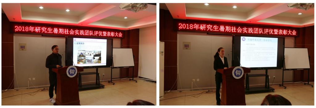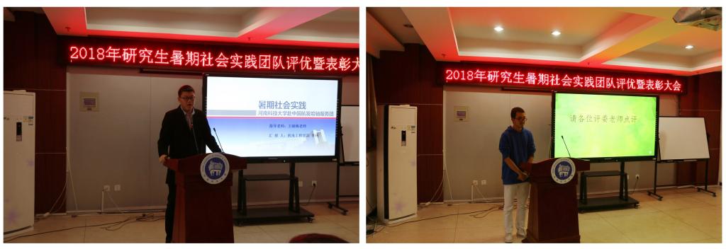 评优答辩会上,申报评优的各研究生暑期社会实践团队进行了汇报演讲和现场答辩。首先上场的医工学院研究生实践队以“理论实践并重,促进全面发展”为题,介绍了他们在驼人集团与技术人员对高分子材料、生物医用材料、电子医疗器械等开展学术研讨和实践活动的成果。机电学院研究生实践队、学校研究生赴航发哈轴实践队分享了在轴承企业实践学习的经历和提高自身学术科研能力的收获。经济学院研究生实践队介绍了他们在汝阳县调研农村电子商务发展的情况,分享了他们为汝阳县电子商务发展和脱贫致富建言献策的成就感。临床医学院研究生实践队讲述了他们为汝阳县群众举办医疗知识讲座、开展远程医疗服务的动人故事。农学院研究生实践队、林学院研究生实践队深入农村开展牡丹、甘薯、花木种植技术服务和病虫害防治,利用自身专业知识帮助种植户掌握专门技术。学校研究生赴校友企业社会实践队分享了校友成功创业的系列故事,优秀校友对母校的深厚情谊、对在校学弟学妹的深情寄语深深地打动了在场师生。农工学院的研究生实践队讲述了他们在企业与技术人员开展科技创新、开发新设备的经历。经专家评委综合评定,“河南科技大学研究生赴校友企业社会实践队”、“机电工程学院研究生‘慈兴’科创技术先锋社会实践队”、“临床医学院研究生赴汝阳县‘互联网+远程医疗’提升项目”获2018年研究生暑期社会实践活动优秀成果一等奖;“林学院研究生桐柏花木使者社会实践队”、“农学院、林学院研究生赴汝阳县科技支农服务队”、“经济学院研究生赴汝阳县农村电子商务发展调研队”获2018年研究生暑期社会实践活动优秀成果二等奖;“研究生赴‘中国航发哈尔滨轴承’社会实践队”、“农学院研究生‘芳华春甸’社会实践队”、“医学技术与工程学院研究生Research and Development of Medical and Engineering社会实践队”、“农业装备工程学院研究生智慧饲喂社会实践队”获2018年研究生暑期社会实践活动优秀成果三等奖。