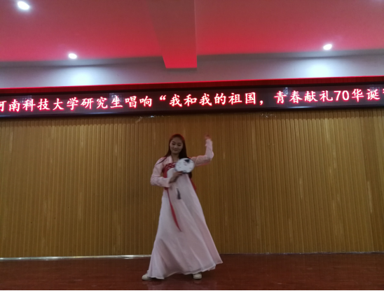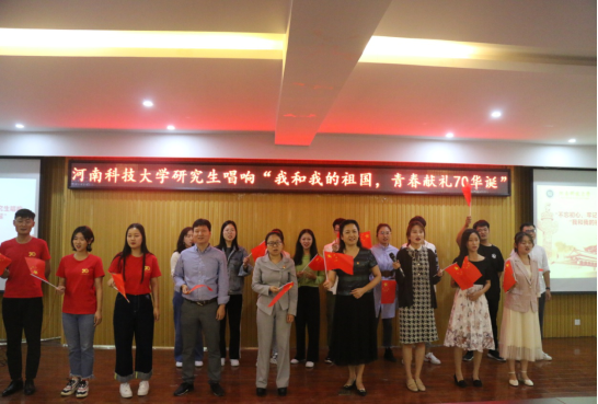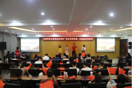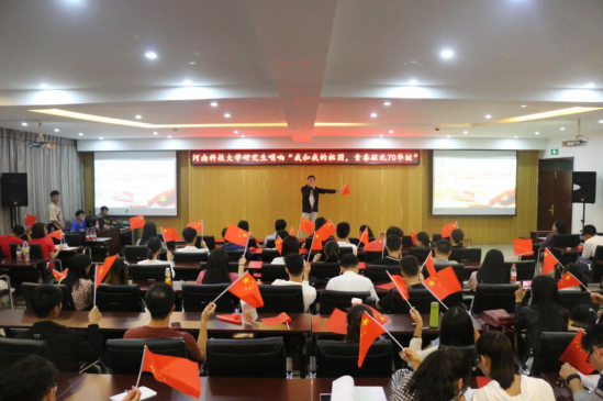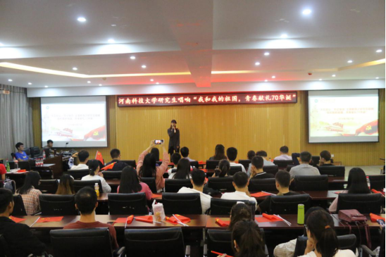 为庆祝中华人民共和国成立70周年,唱响礼赞新中国、奋进新时代的青春主旋律,激励引领广大研究生大力弘扬以爱国主义为核心的伟大民族精神,进一步坚定“四个自信”,激发广大研究生的爱国情感和奋斗热情,河南科技大学研究生唱响“我和我的祖国,青春献礼70华诞”活动于2019年9月27日晚在工科1号楼5059报告厅举行。党委研究生工作部部长王晓梅教授、副部长张静老师、研究生教育管理科科长陈建峰老师和百余名研究生欢聚一堂,共庆新中国70华诞。