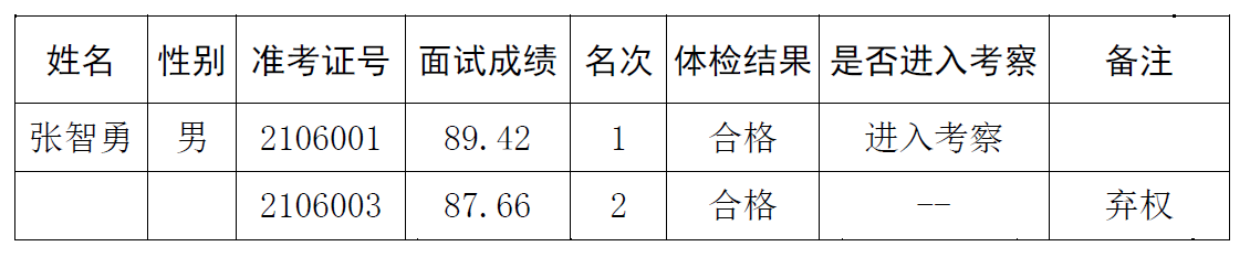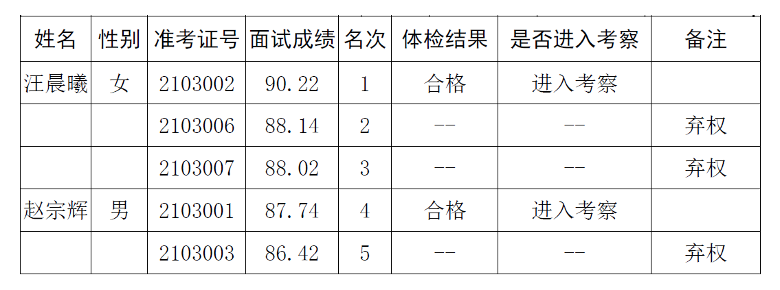 根据《汝阳县2021年引进研究生学历人才公告》相关规定,经过网上报名、资格审查、面试、体检等环节,现将相关事宜公告如下: