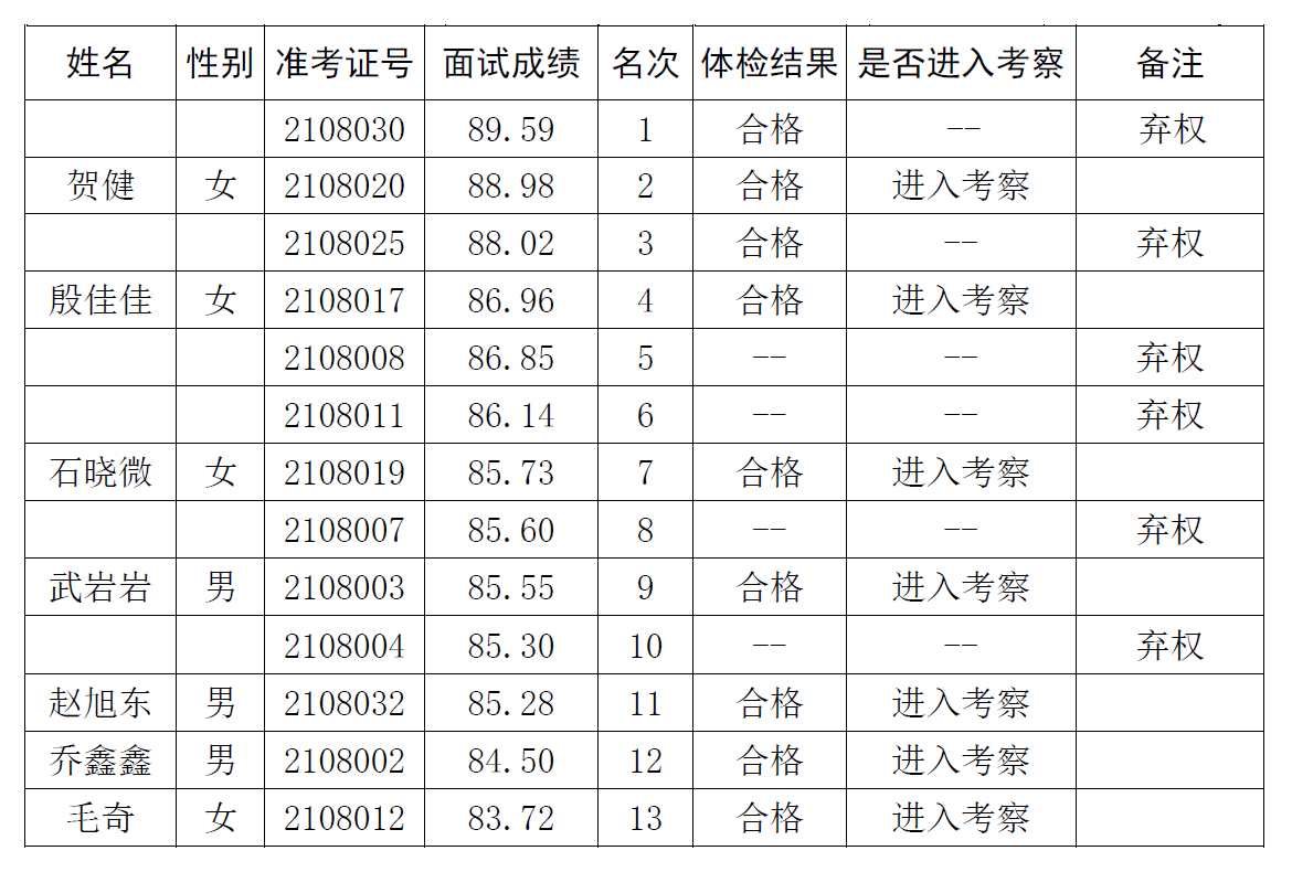 2103岗位计划引进3人,因考生个人原因弃权,按面试成绩由高分到低分进行递补,2103岗位没有递补考生,实际参加体检2人,因此核减1个引进计划数。