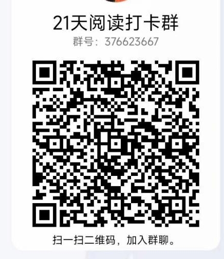本次读书打卡活动的时间为2023年5月4日-2023年5月24日。有意向参与活动的同学扫描二维码进入QQ群(376623667),并将备注改为“姓名+学院+年级专业”。5月4日开始,QQ群会每天发布学习内容,同学们进行学习打卡,活动结束后将组织线下考试。