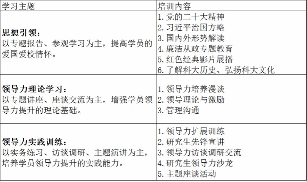 分为思想引领、领导力理论学习、领导力实践训练三个模块,采用多元化的形式引导和培养。