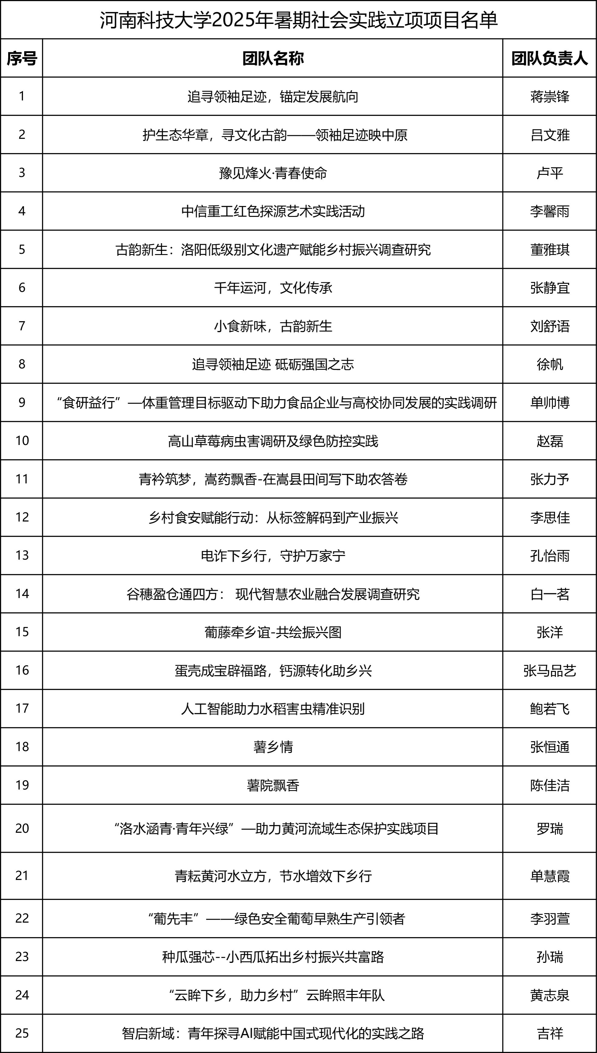 根据《关于申报河南科技大学2025年研究生暑期社会实践项目的通知》要求,经研究生自主申报、学院推荐、研工部组织立项评审,确定以下研究生暑期社会实践团队予以立项,请各实践队按照暑期社会实践工作要求开展相关活动,并做好安全防范措施。