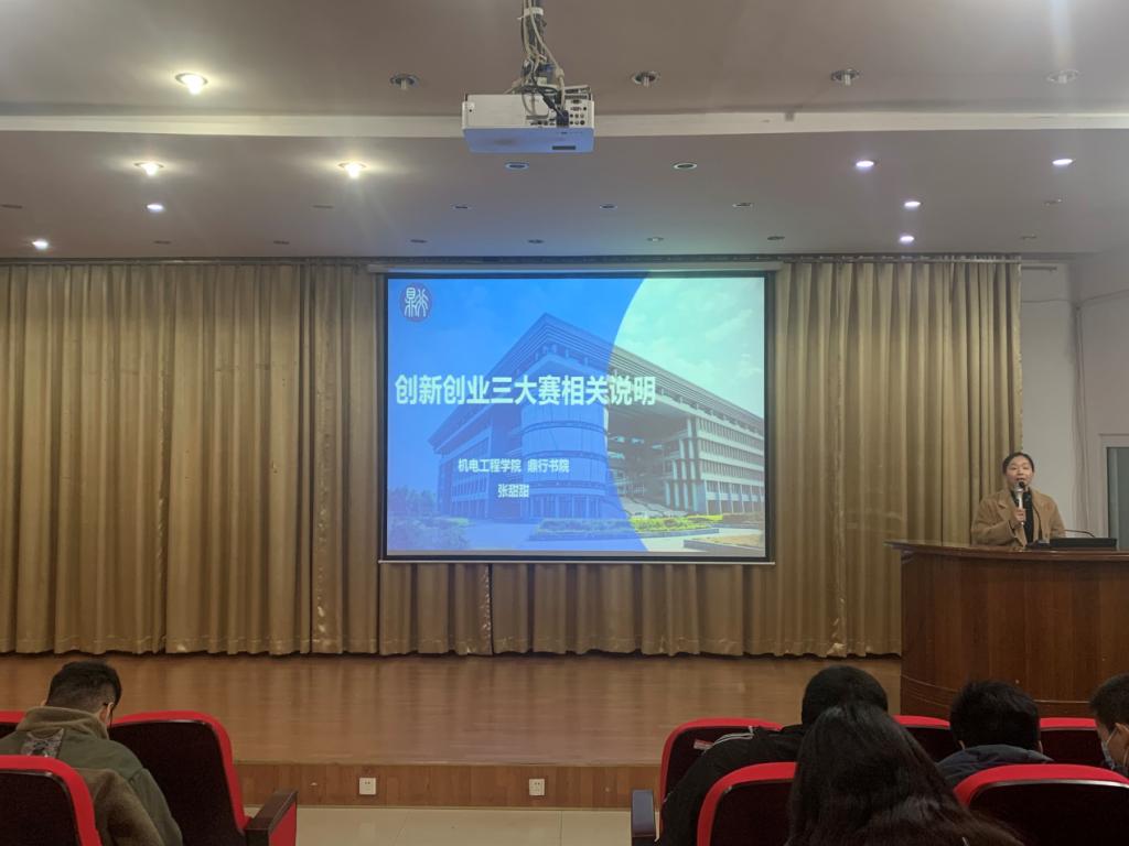 张书记对“挑战杯”、“互联网+”和“创青春”大赛做了详细介绍,向同学们展示了机电工程学院近五年所取得的优异成绩,鼓励同学们积极参加比赛,依托学校提供的优秀平台,在创新创业大赛中提升自己、奋力前行。