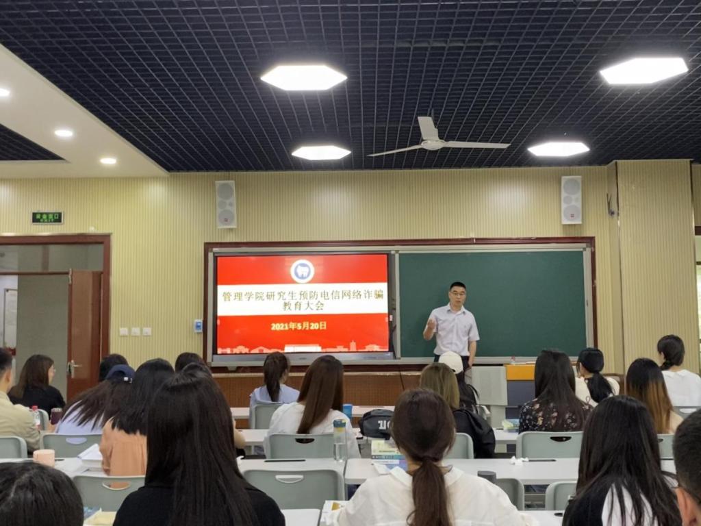 为切实做好研究生校园安全教育工作,保护学生人身和财产安全,提高研究生识骗、防骗意识和能力,预防和减少电信网络诈骗案件的发生,5月20日下午四点半,管理学院研究生预防电信网络诈骗教育大会在文科1号楼S305举办,本次会议由管理学院党委副书记徐家宁主持,全体全日制研究生参加会议。