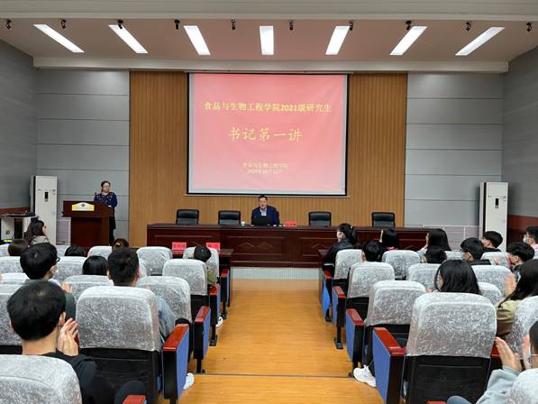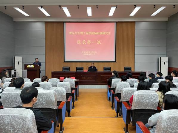 古院长首先对2021级全体研究生的到来表示欢迎,并向同学们详细介绍食品与生物工程学院的历史沿革和卓越成就。随后诠释了学院各类别各领域研究生培养方案的具体要求。他提出,同学们应该夯实学科基础,提升创新能力,恪守学术道德,自觉抵制学术不端行为。紧接着,古院长从合理规划目标、科研能力培养、师生关系、人际交往以及心态调节等五方面分析如何成为一名合格的研究生,他勉励2021级研究生要以非凡的胆识和勇气,以不忘初心的学术情怀,砥砺前行,拿出丰硕的研究成果,为解决当前社会面临的重要现实问题提供可行的思路和方案,为早日实现中华民族伟大复兴的中国梦贡献一份力量。