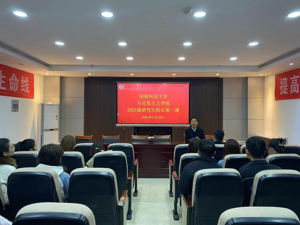 10月12日下午,马克思主义学院在河南科技大学开元校区文科1号楼802会议室开展2021级研究生入学教育之“书记第一讲”、“院长第一课”,活动由马克思主义学院党委书记马隽戎、院长刘振江主讲,副院长苗贵山主持本次活动,2021级全体研究生参加。