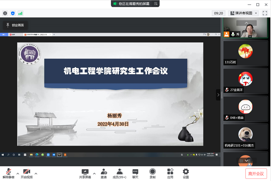 为切实保障广大研究生的身体健康和校园安全稳定,同时传达西苑校区公寓空调租赁、假期安排、疫情防控等相关事宜,4月30日下午,机电工程学院在线上召开了研究生工作会议。此次会议由机电工程学院研究生辅导员杨丽秀主持,全体研究生参加。