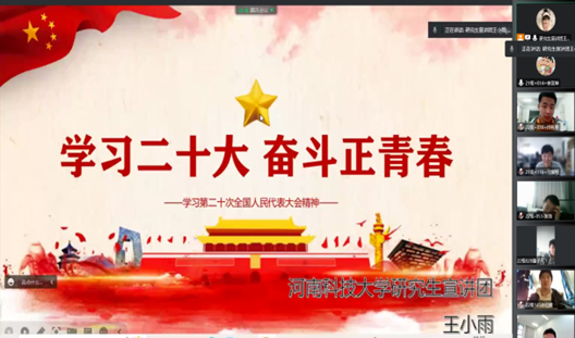 10月27日上午,机电工程学院在线上组织开展“学习二十大,奋斗正青春”研究生主题教育活动。本次活动由河南科技大学党委研究生工作部主办,河南科技大学研究生宣讲团成员王小雨主讲。机电工程学院全院研究生参加。