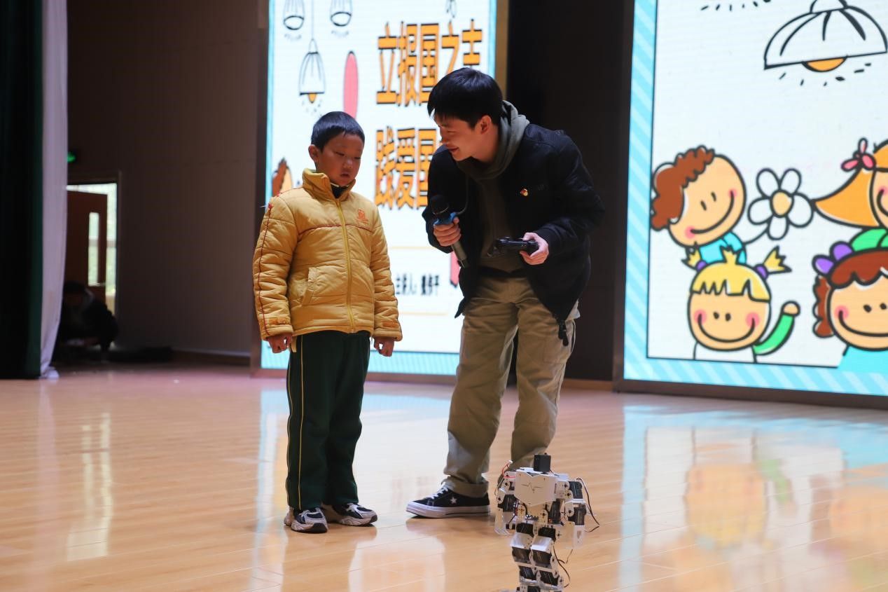 活动伊始,22级博士生魏伟平以“立报国之志,践爱国之行”为主题为同学们做了一场生动的爱国主义讲座。硕士研究生李治彬、孙晓威介绍了钢琴机器人、跳舞机器人、激光越野车设计原理和构成,团队成员通过操作机器人和越野车进行了动作表演。20级本科生王一波向在场的同学们展示了航模战斗机飞行表演。在交流互动环节,小朋友们零距离接触机器人与航模飞机,通过观看人工智能动画,进一步深入了解机器人知识,感受科技的魅力。在提问环节,团队成员解答了小朋友的疑惑,满足他们对科学知识的好奇心。