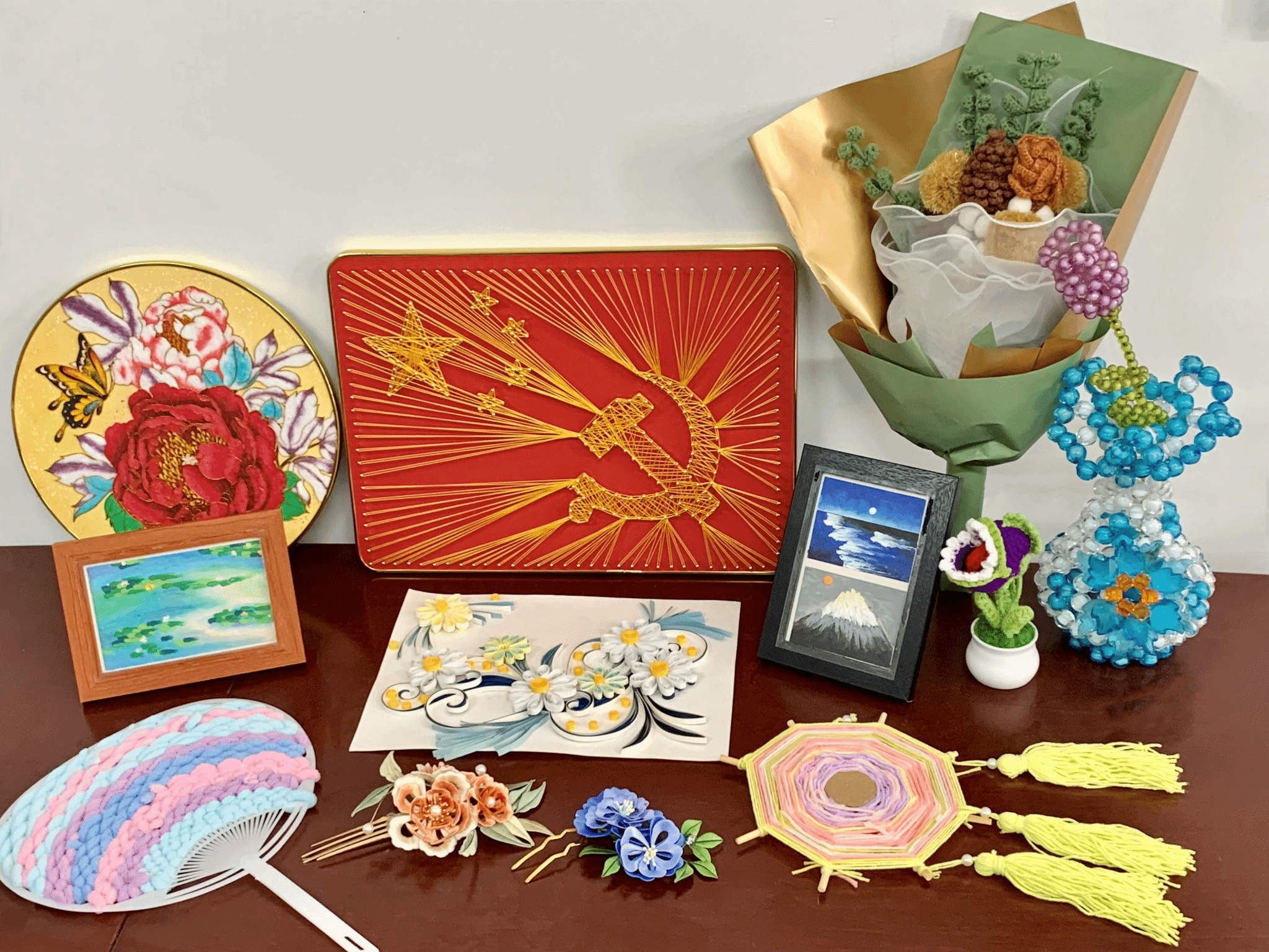 经过院研究生会的精心策划和组织,同学们纷纷积极响应,热情参与,用自己的巧手和匠心创作出了许多优秀的作品。其中,非遗文化作品芍药缠花和牡丹缠花、牡丹掐丝珐琅画、钩针编织复古花束、绕钉制五星红旗和党徽等11件作品进入决赛。最终,经过学院教师投票,陈功同学的复古花束获得一等奖,张丽同学的党徽作品以及刘冠宇同学的掐丝牡丹获得了二等奖,洪清浩、翟耘佩、赛格和吕梦薇四位同学的作品获得三等奖。
