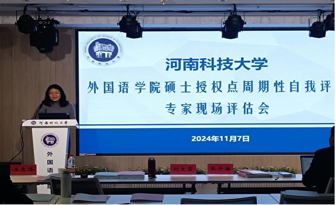 根据河南省学位委员会办公室关于做好2020—2025年学位授权点周期性合格评估的通知,河南科技大学外国语学院硕士学位授权点评估汇报会于11月7日周四下午3点在文1-S307召开。会议特邀华北水电水利大学刘文霞教授、上海外国语大学韩子满教授、洛阳师范学院陆志国教授、郑州大学王志伟教授、河南理工大学李红教授、郑州易线通翻译公司翟小娟经理担任校外评审专家。外国语学院院长张喆教授主持会议并致辞,学院班子成员及师生代表参加会议。