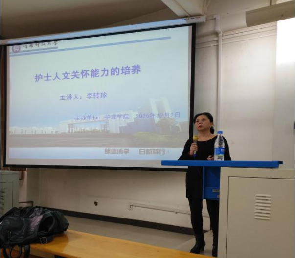 2016年12月2日下午,护理学院在公教4-401教室举办了“护士人文关怀能力的培养”专题讲座,此次讲座邀请到硕士生导师、第一临床教研室主任兼河南科技大学第一附医院内科系护士长李转珍老师担任主讲。研究生辅导员、2016级全体研究生参加此次讲座。会议由第二临床教研室主任张洛灵老师主持。