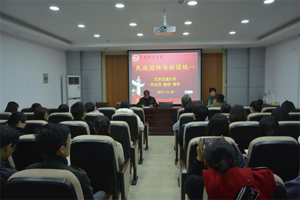 何玉芳教授首先从自己的少数民族身份——赫哲族说起,指出自己是赫哲族历史上走出来的首位女博士,并从自身经历说明少数民族在党的坚强领导下发生了翻天覆地的变化,强调党和国家实行的民族政策符合我国的基本国情,深受广大少数民族欢迎的。接着她从党的十九大报告中规定的“深化民族团结进步教育,铸牢中华民族共同体意识,加强各民族交往交流交融,促进各民族像石榴籽一样紧紧抱在一起,共同团结奋斗、共同繁荣发展”这一重要论断,讲述民族团结与国家统一的重要性,希望大家牢固树立中华民族共同体意识,努力学习,为实现中华民族伟大复兴的中国梦而努力奋斗。最后,何老师结合自身的教育经历,特别是从事教学研究的经历,向同学们传授如何选题、如何进行科学研究的经验,希望同学们能够继续深造,热烈欢迎大家报考北京交通大学的博士生。宋清华教授在总结时强调,何老师的报告情感丰富,内容详实,精彩纷呈,给我们展示了一个充满柔情和爱国情感的锦绣画卷,让我们更加清楚中华民族的发展脉络。他希望同学们能够好好品味何老师的报告,科学定位自己,刻苦奋斗,早日实现自己的梦想。
