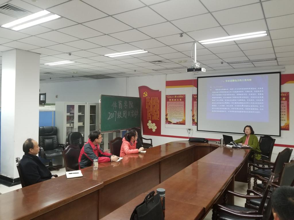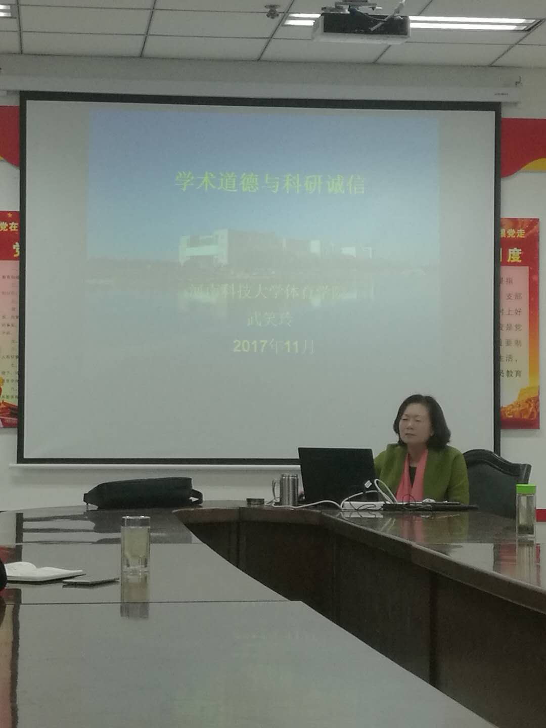 2017年12月6日8:30上午,体育学院在图书馆113室对全体研究生开展了学术道德与科研诚信学术讲座。本次讲座由体育学院院长武笑玲教授主讲,党委书记苏伟峰主持。