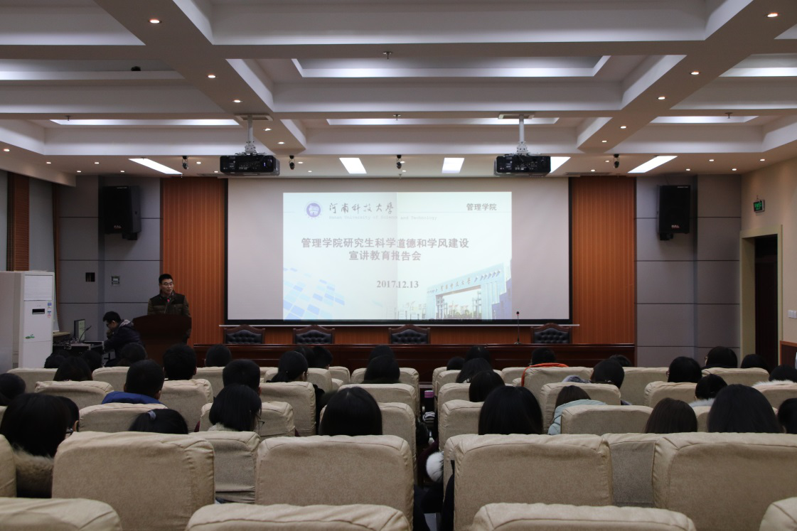 为学习贯彻党的十九大精神,加强科学道德与学风建设,培养严谨的治学态度,形成良好的学风,河南科技大学管理学院全体研究生于2017年12月13日18:30在开元校区文科1号楼S105会议室召开“学习贯彻党的十九大精神——2017年全国科学道德与学风建设宣讲教育报告会”。本次会议由河南科技大学管理学院研究生辅导员徐家宁老师主持。