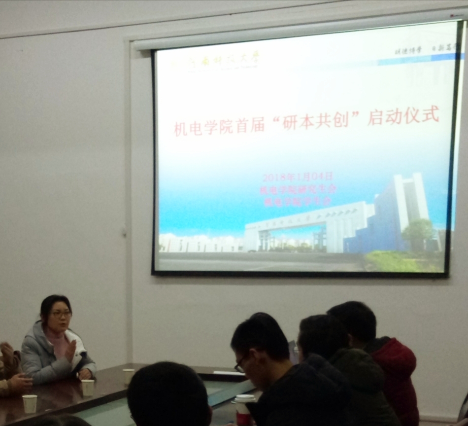 2018年1月4日,河南科技大学机电工程学院首届“研本共创”启动仪式于西苑校区三号楼515室举行。机电工程学院团委书记张小花、机电工程学院研究生分会主席盛青志、机电学院学生会主席赵梓暄等出席启动仪式,院研分会宣传部、科创部相关人员,部分研究生、本科生代表一同参加了有关活动。