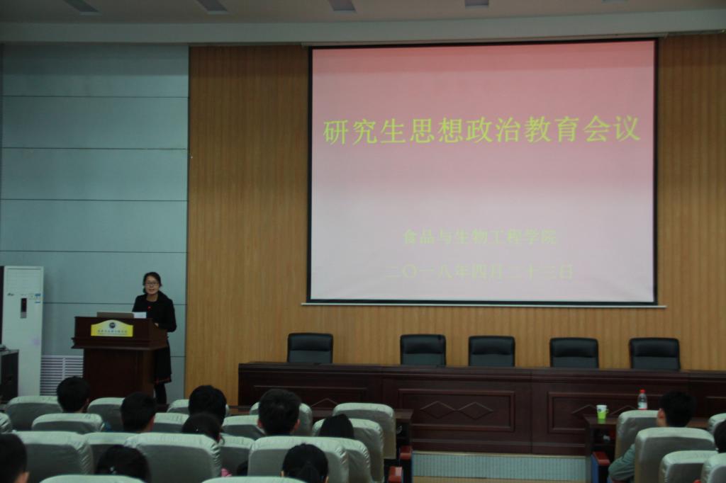 为深入学习贯彻党的十九大精神和全国高校思想政治工作会议精神,进一步加强和提高我院研究生思想政治教育水平,引导研究生树立正确的舆论关注导向,食品与生物工程学院于4月23日下午在工科4号楼206会议室召开全院研究生思想政治教育会议。