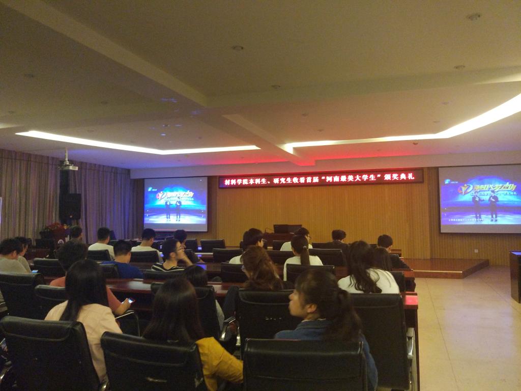 为了深入学习贯彻习近平新时代中国特色社会主义思想和党的十九大精神,进一步弘扬社会主义核心价值观,引导青年学生自觉增强社会责任感和使命感,材料学院于2018年5月11日在工科一号楼5059室组织学院全体研究生观看“河南最美大学生”颁奖典礼。
