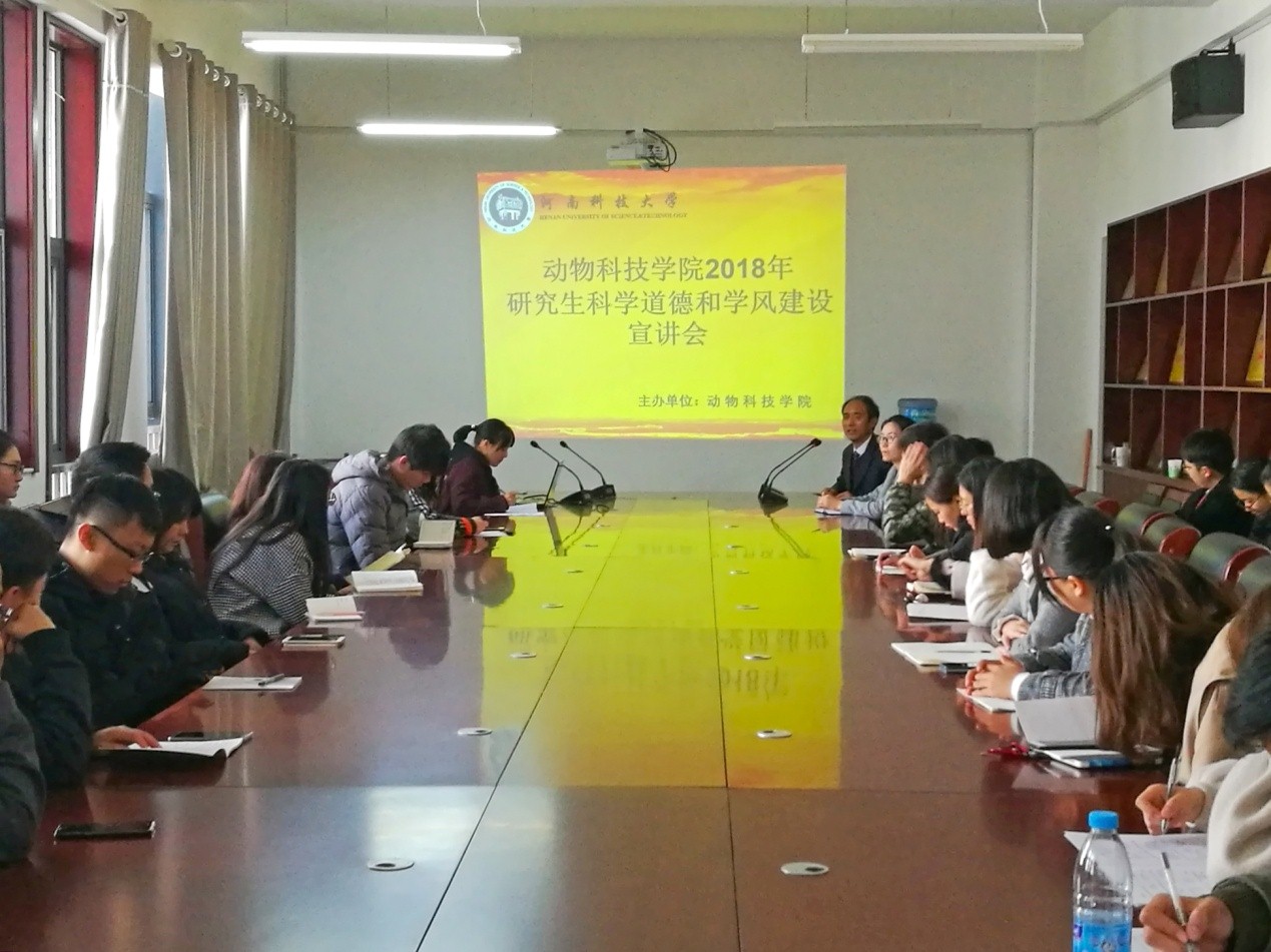 为大力弘扬学术道德,促进学风建设,河南科技大学动物科技学院举办的科学道德和学风建设宣讲会于11月23日上午在动科楼336会议室进行,动科学院副院长王占彬教授、研究生辅导员程希和学院全体研究生参加会议,会议由学院研究生会主席邵琦主持。