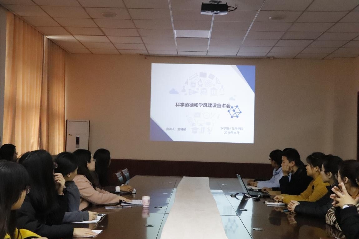 11月26日,农学院/牡丹学院于农科1号楼215会议室成功举办主题为“研究生要培养优良的科研学风”的研究生科学道德和学风建设宣讲会,会议由研究生辅导员雷峬峭主持。