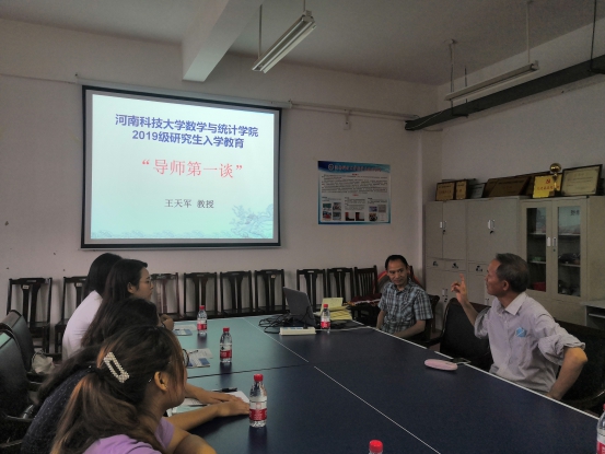 9月9日下午,数学与统计学院2019级研究生入学教育“导师第一谈”在工科4号楼637会议室举行。数学与统计学院副院长王天军教授作为导师代表为全体2019级研究新生讲述了如何做一名优秀的硕士研究生,我院2019级全体研究生参加了座谈会。此次座谈会由研究生秘书刘长河老师主持。