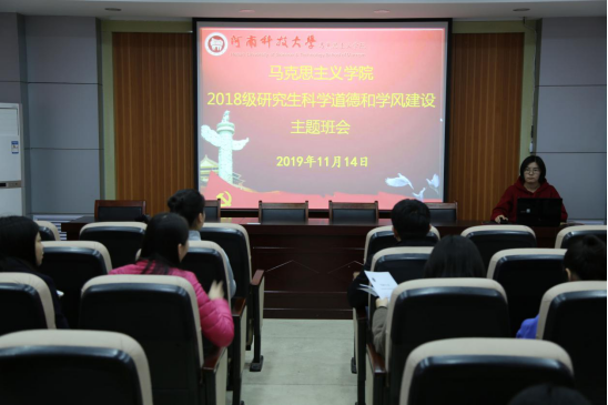 2019年11月14日上午,马克思主义学院18级研究生在文一802教室开展科学道德和学风建设主题班会,2018级全体研究生积极参与。