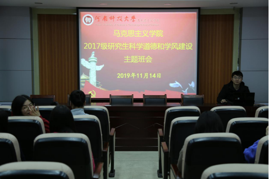 为深入学习习近平总书记关于科学道德和学风建设的重要指示精神,响应《2019年全国科学道德和学风建设宣讲教育报告会》,落实校研工部举办“不忘初心、牢记使命”主题教育之2019年研究生科学道德和学风建设宣讲教育活动月”的有关要求,增强本班研究生的科学道德精神和学风自律意识,马克思主义学院2017级全体研究生于2019年11月14日上午在文科楼802教室开展“科学道德和学风建设”主题班会。
