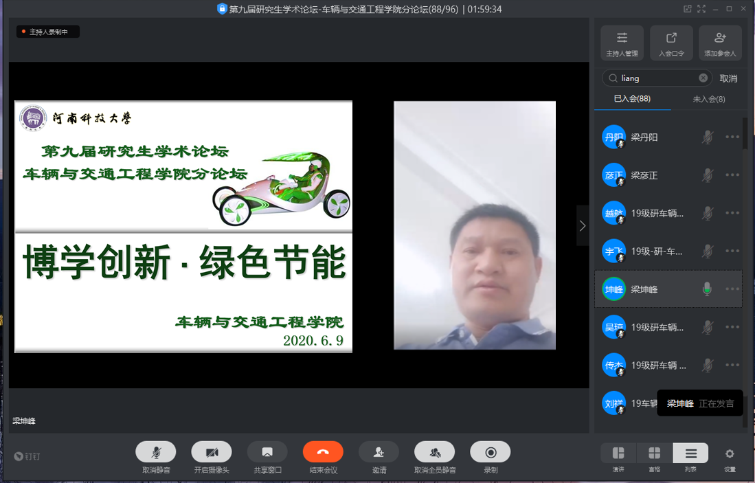 2020年6月9日上午,河南科技大学第九届研究生学术论坛车辆与交通工程学院分论坛在钉钉网络平台成功举办。分论坛的举办形式为线上直播和线上互动。此次学术论坛由车辆与交通工程学院徐立友副院长主持,学院主要领导、研究生导师以及全体研究生参加了活动。