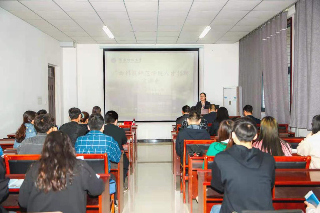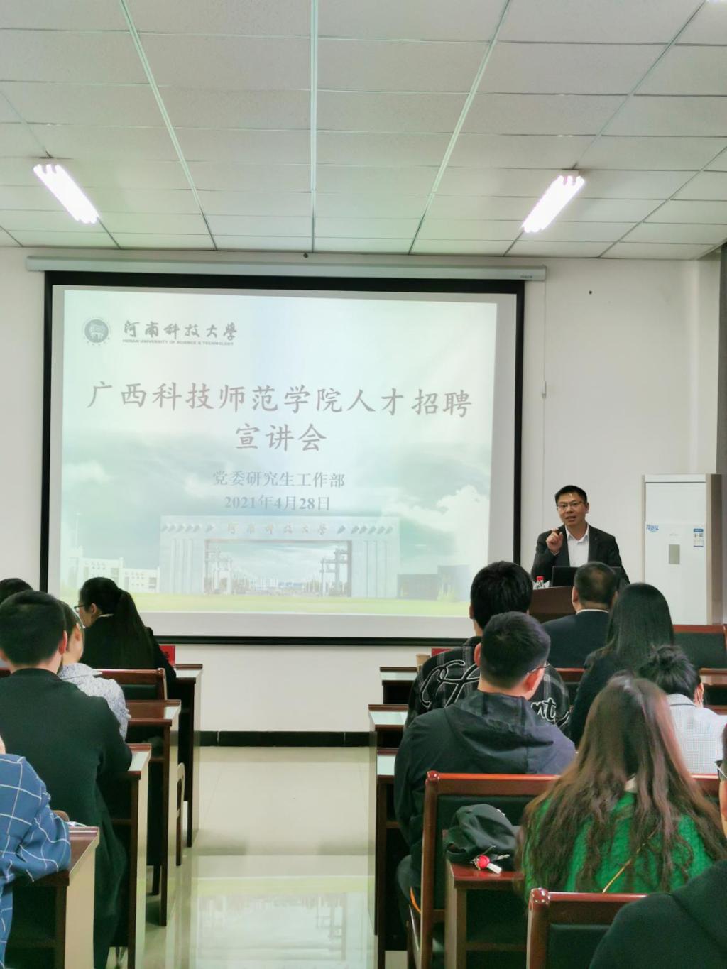 2021年4月28日下午,广西科技师范学院人才招聘宣讲会在开元校区农科3号楼331会议室顺利举行。广西科技师范学院副校长周叮波,食品与生化工程学院院长蒋才云,图书馆副馆长陈红球出席此次宣讲会。宣讲会由河南科技大学党委研究生工作部副部长张静主持,广西科技师范学院副校长周叮波主讲。