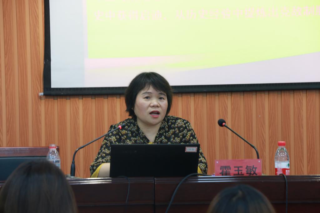 讲座伊始,霍玉敏带领大家回顾了中国共产党由开天辟地到改天换地、翻天覆地、惊天动地的百年党史。随后她指出党史是最好的营养剂,一部峥嵘党史记录着艰辛奋斗和惊世奇迹,记录着光辉理论和宝贵经验,也见证了信仰之美、使命之重、英雄之气、崇高之志。最后她表示我们应当学习中国共产党在一步步走过来的过程中不断总结经验、提高本领,不断提高应对风险、迎接挑战、化险为夷的精神,从历史中获得启迪,从历史经验中提炼出克敌制胜的法宝。
