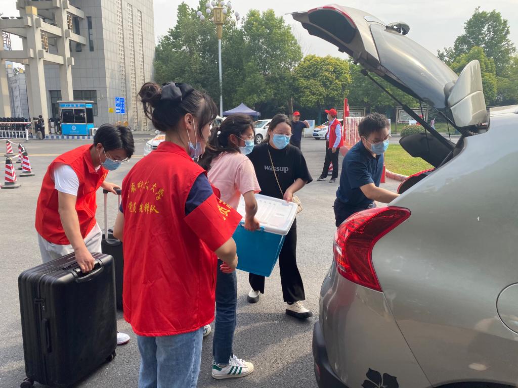 报到现场,气氛热烈却又井然有序,同学们在志愿者的引导下,经过行李消毒、测温、提交核酸检测证明、学院登记等环节,有条不紊地进行入校手续办理。研究生志愿者们为同学们搬运行李、登记信息,协助教工党员爱心车队运送物品。