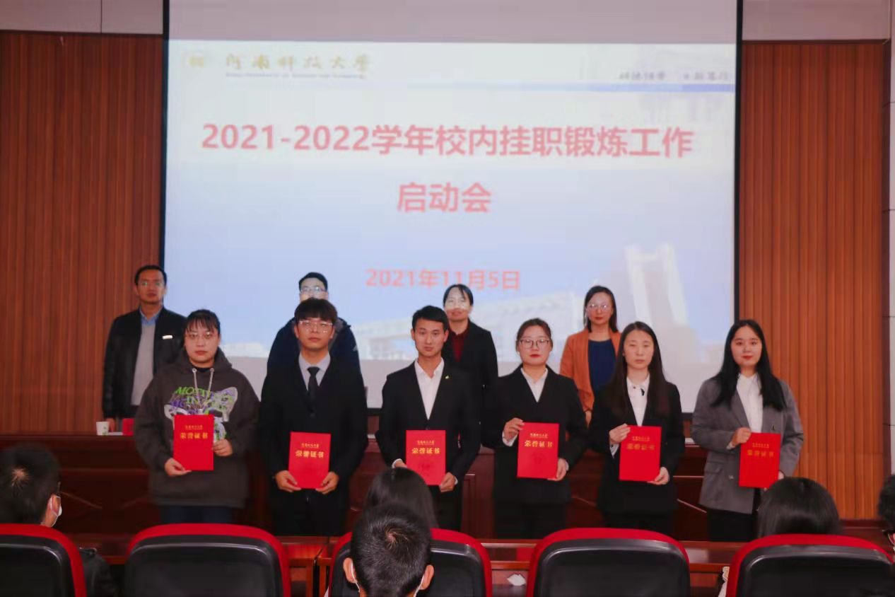 会议在庄严的国歌声中拉开序幕。王泽远作2020-2021年度研究生校内挂职锻炼工作总结,并对2021级挂职锻炼新生表示热烈欢迎。张扬宣读《关于对河南科技大学2020-2021学年挂职锻炼优秀研究生进行表彰的决定》;胡前胜宣读《河南科技大学2021-2022年度校内挂职锻炼研究生名单》。与会领导为校内挂职锻炼优秀研究生颁发荣誉证书。