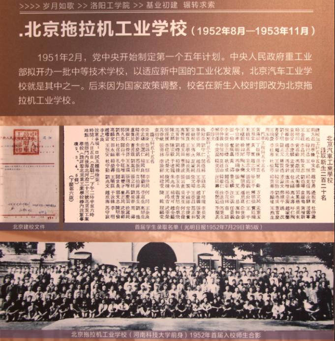 6月29号下午,团队参观了河科大校史馆,校史陈列馆采用通史陈列方式,其中历史阶段以文字介绍、照片、实物、近代史料文献为主,辅以体现办学历史的场景,生动讲述了上起北京拖拉机工业学校基业初建,下至河南科技大学再创辉煌的历史。团队成员结合着校史上下卷埋身其中,理清了其中几个关键的历史节点。北京拖拉机工业学校(1952.8-1953.11),天津拖拉机制造学校(1953年12月-1956年4月),而后转到洛阳办学。