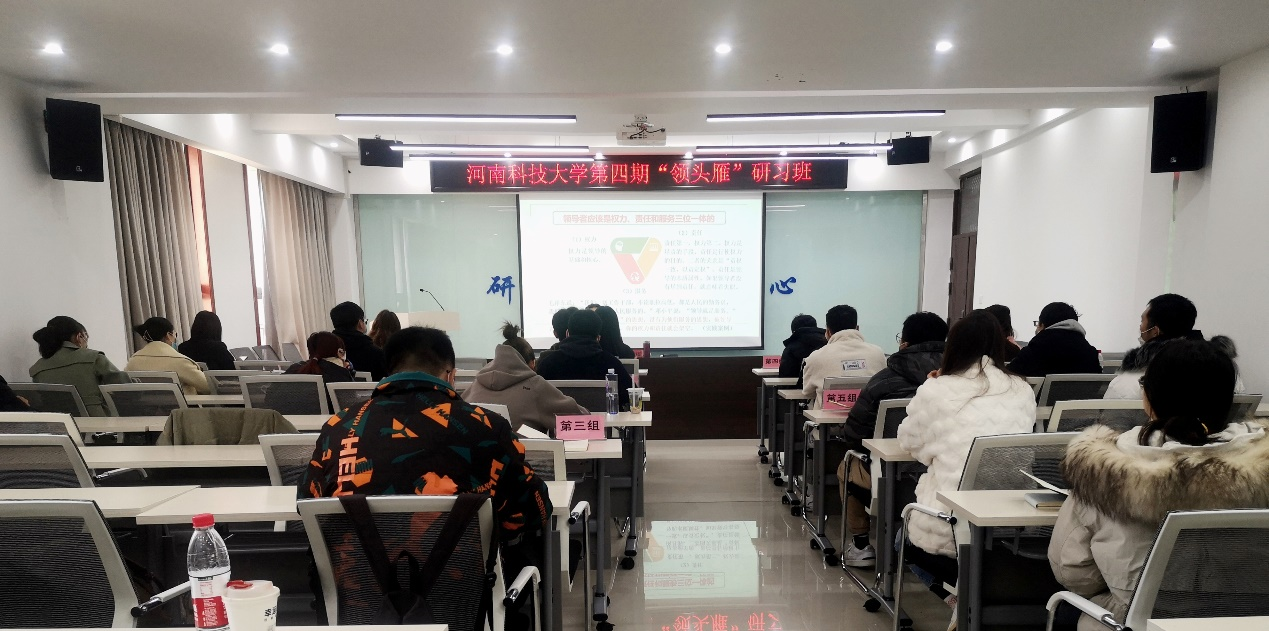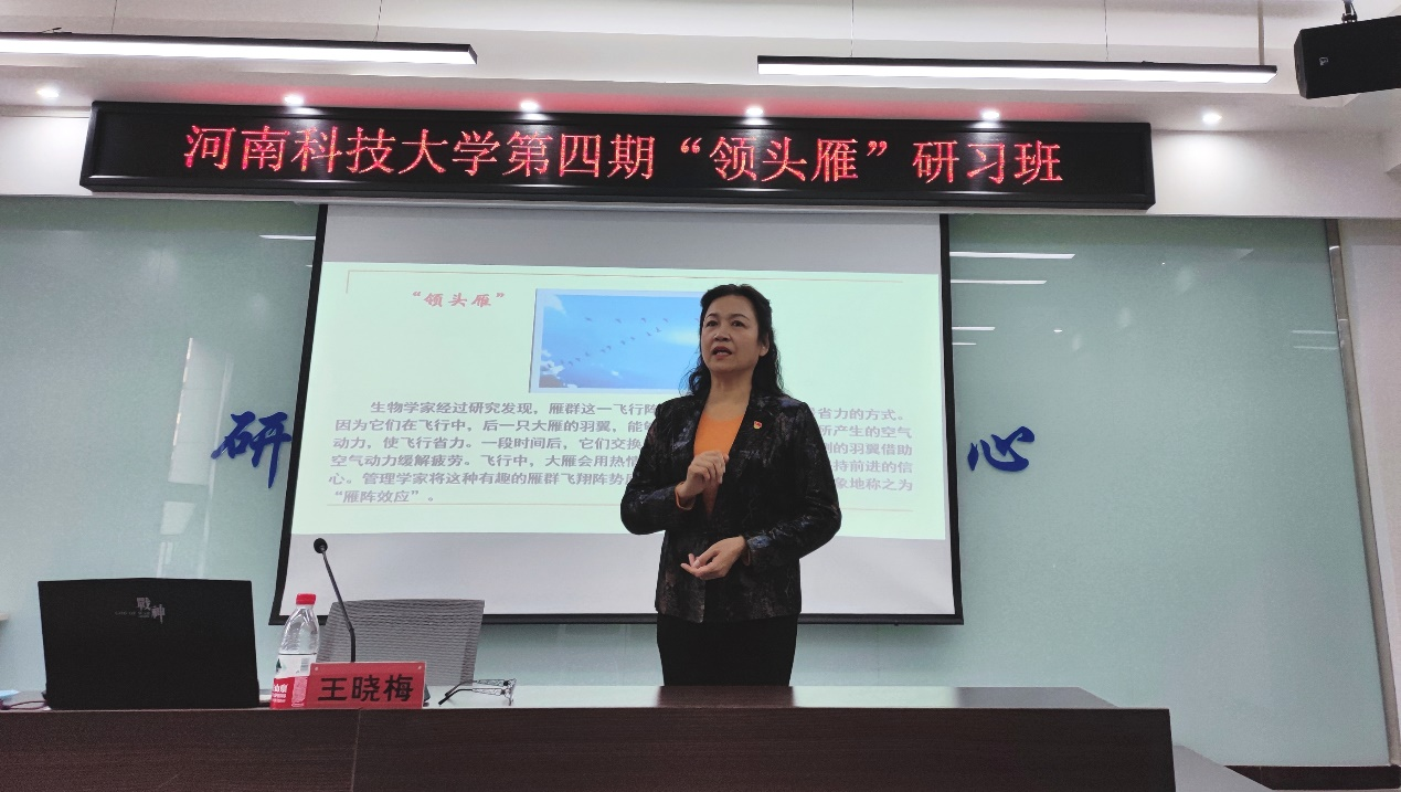 12月5日上午,河南科技大学管理学院教授王晓梅在研究生跨学科交流中心,为第四期研究生“领头雁”研习班学员做《领导理论与实践》的专题讲座。讲座由管理学院2020级研究生董金金主持。