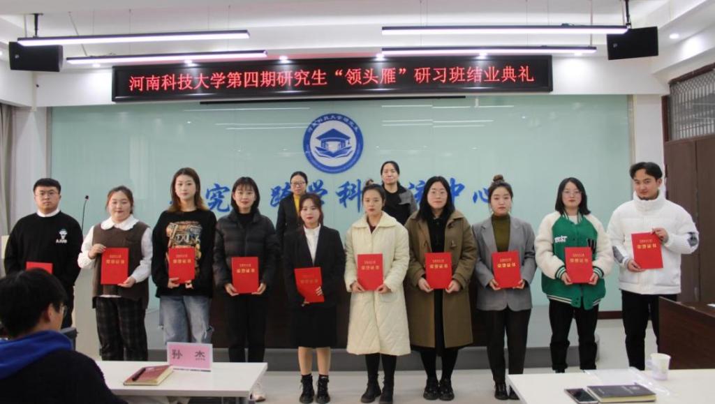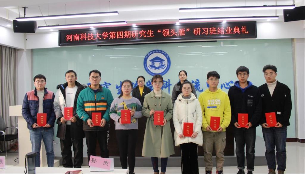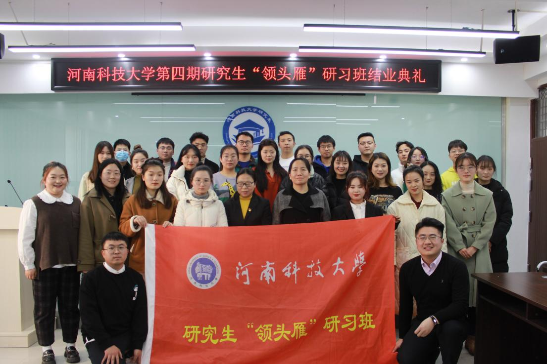 12月19日下午,河南科技大学第四期研究生“领头雁”研习班结业典礼在研究生跨学科交流中心举行。参加仪式的有党委研究生工作部副部长张静、思政教育科科长陈洁、第四期研究生“领头雁”研习班全体成员,仪式由第四期“领头雁”研习班班长赵毅威主持。