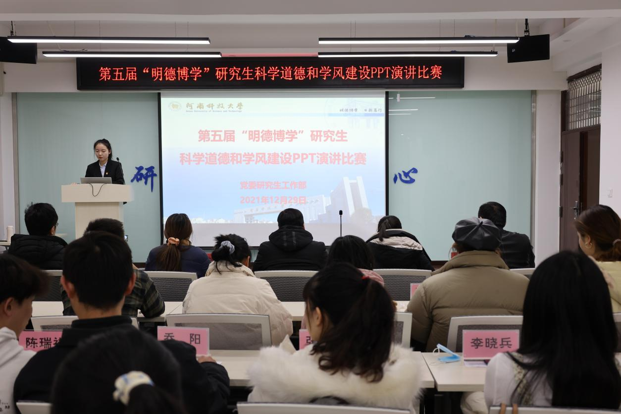 为进一步加强我校研究生科学道德和学风建设,营造良好的育人环境,促进研究生学术生涯的健康发展,12月29日下午,由党委研究生工作部主办、研究生学术文化中心承办的河南科技大学第五届“明德博学”研究生科学道德与学风建设PPT演讲比赛决赛在跨学科交流活动中心成功举办。车辆与交通工程学院党委副书记陈建峰、丽正书院党委副书记许彤、学生工作处思想政治教育科科长张晓洁、党委研究生工作部管理科科长王泽远、艺术与设计学院张辉及21位大众评委和各单位研究生代表参加。比赛由医学技术与工程学院2021级研究生于琬晴主持。