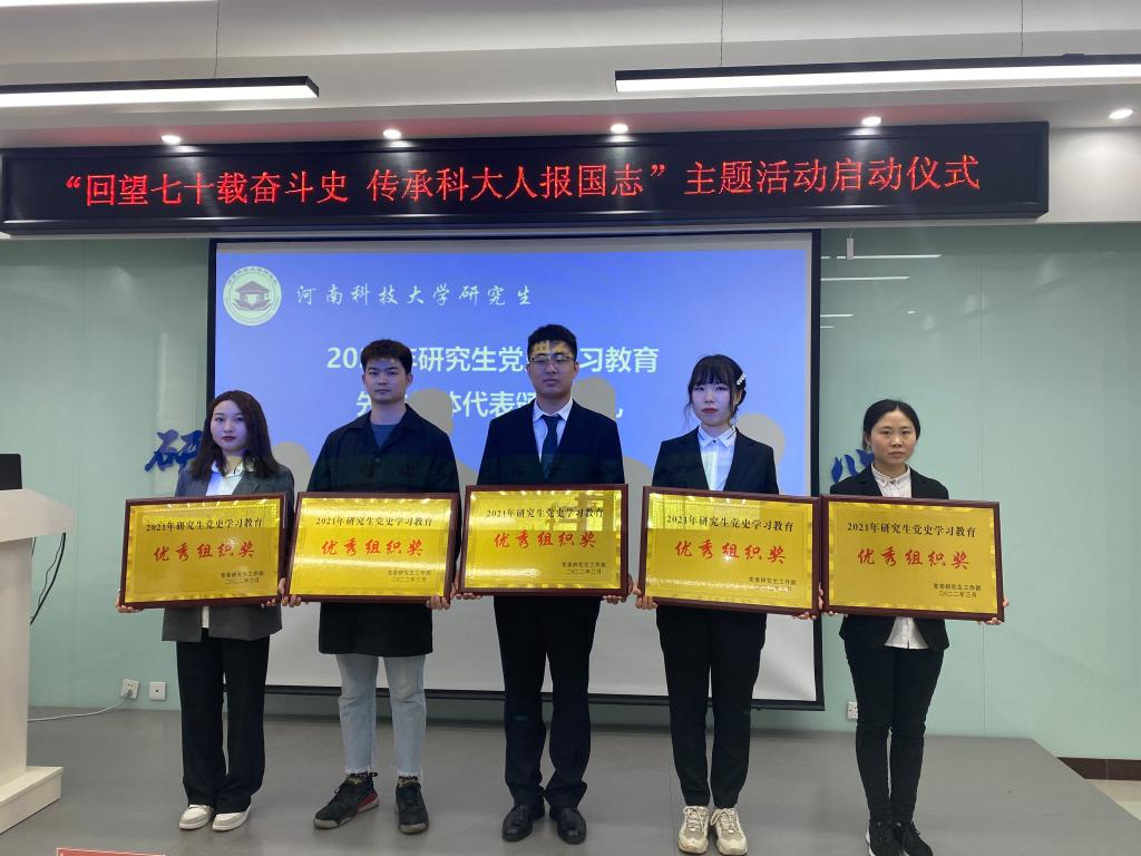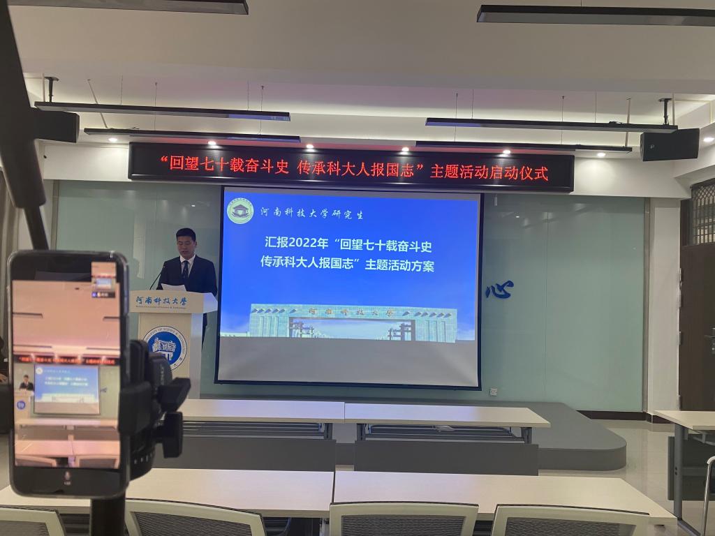 为迎接河南科技大学建校七十周年,赓续红色基因,传承家国情怀。3月25日下午,河南科技大学研究生2021年党史学习教育工作总结暨2022年“回望七十载奋斗史 传承科大人报国志”主题活动启动仪式,通过线上直播的方式顺利进行,校研究生会及各学院研究生会全体成员在线参加。会议由2021-2022学年校研究生会秋季执行主席赵毅威主持。