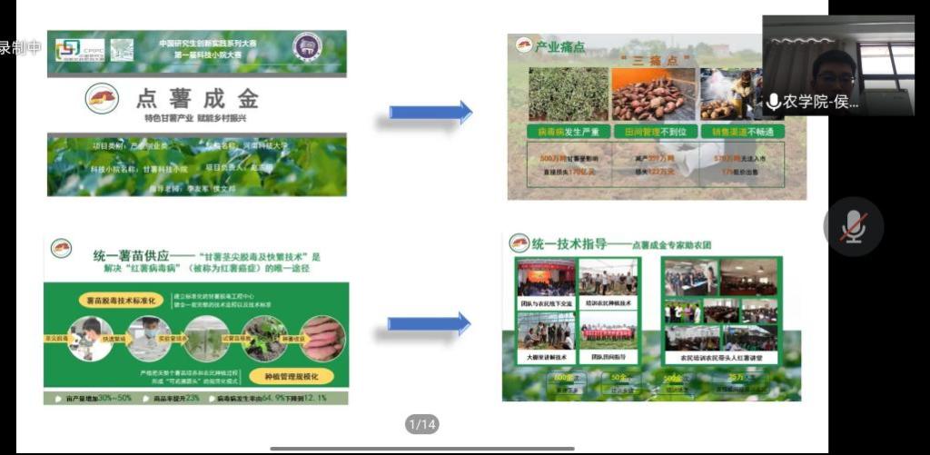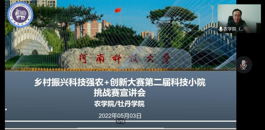 2022年5月3日下午,由农学院(牡丹学院)举办的乡村振兴科技强农+创新大赛第二届科技小院挑战赛宣讲会顺利举行。为配合疫情防控工作,本次会议形式采取线上进行。会议由农学院(牡丹学院)宋鹏副院长主持,第一届科技小院挑战赛校一等奖获得者侯园泉、史帅营为主讲人,涉农学院近200名研究生在线参与。
