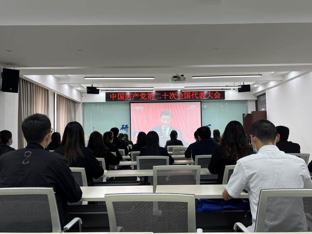 在直播现场,师生们认真聆听、学习习近平总书记代表十九届中央委员向大会所作的报告。习近平总书记提出:高举中国特色社会主义伟大旗帜,全面贯彻新时代中国特色社会主义思想,弘扬伟大建党精神,自信自强、守正创新,踔厉奋发、勇毅前行,为全面建设社会主义现代化国家、全面推进中华民族伟大复兴而团结奋斗。