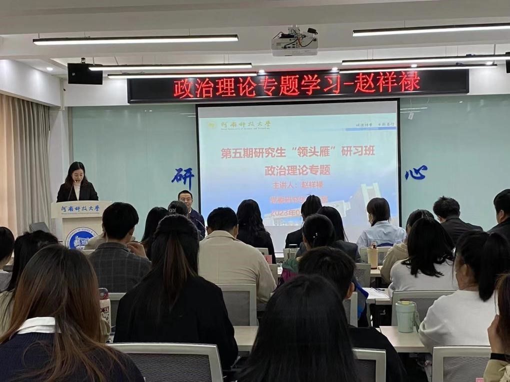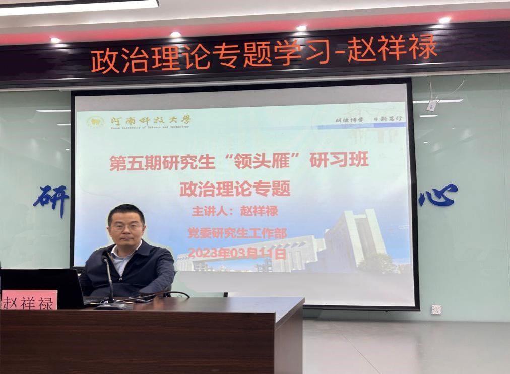 3月11日上午,河南科技大学党委宣传部部长赵祥禄在开元校区研究生活动中心为第五期研究生“领头雁”研习班学员开展《政治理论专题》讲座。本次讲座由商学院2021级研究生刘佳钰主持。