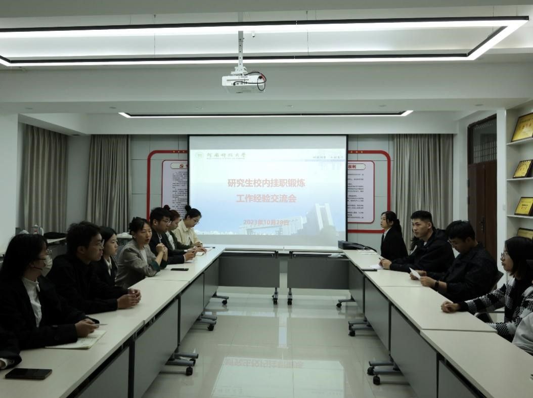 评优暨启动仪式结束后,研工部在研究生活动室举办研究生挂职工作经验交流会,研究生管理科副科长张扬、机关挂职锻炼代表、辅导员助理代表、挂职锻炼各中心主任参加会议。会上,研究生同学们总结交流了挂职过程中的工作方法,对进一步做好研究生挂职锻炼工作提出了建议。