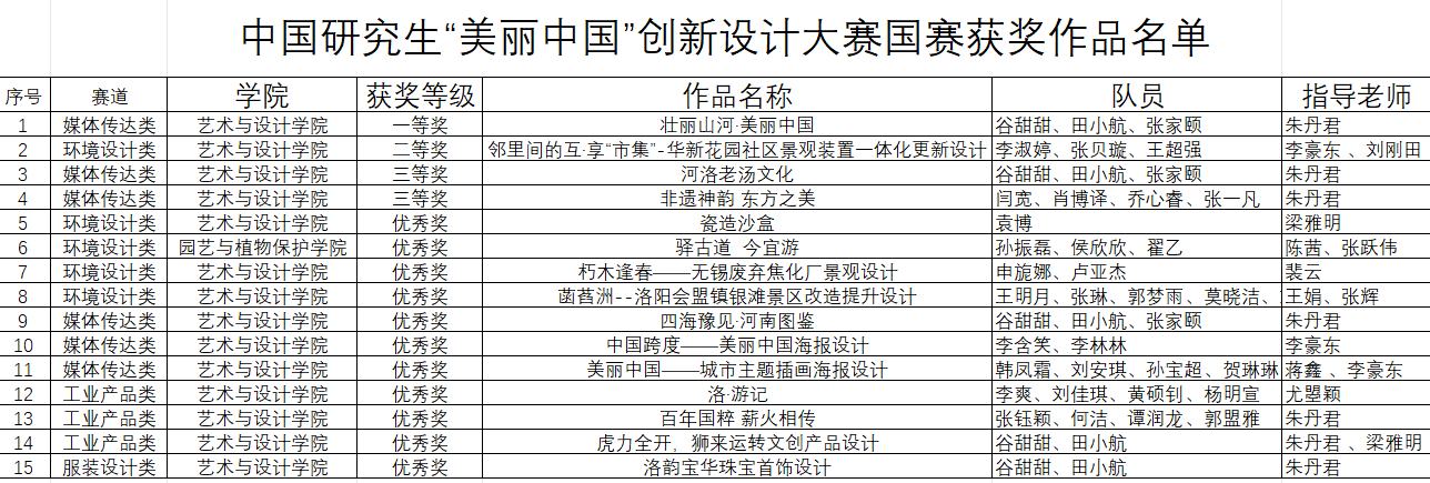 11月26日,由中国学位与研究生教育学会主办的首届中国研究生“美丽中国”创新设计大赛总决赛在杭州建德落下帷幕。我校最终荣获全国总决赛一等奖1项、二等奖1项、三等奖2项、优秀奖11项,我校荣获“优秀组织奖”,也是河南省此项比赛获奖最多的高校。