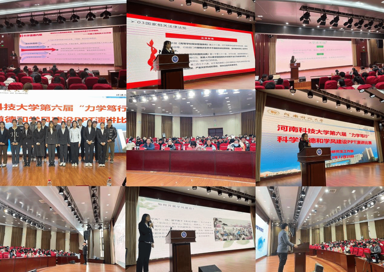 为进一步加强我校研究生科学道德和学风建设,搭建良好的育人平台,促进研究生学术生涯的良性发展,12月20日上午,由党委研究生工作部主办、研究生学术文化中心承办的河南科技大学第六届“力学笃行”研究生科学道德与学风建设PPT演讲比赛决赛在医科-医学发展中心成功举办。学生工作处副处长张怡帆老师,校团委副书记孔蓓蓓老师,丽正书院副书记许彤老师,河洛书院副书记张小花老师,党委研究生工作部管理科科长王泽远老师出席会议并担任评委。比赛由食品与生物工程学院2023级研究生李亚林主持。